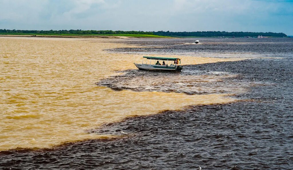The Rio Negro — the Amazon’s largest left-bank tributary and the world’s largest blackwater river — joins the Amazon at Manaus in a phenomenon known as the Meeting of the Waters. The dark, tannic waters of the Rio Negro and the pale, sediment-rich waters of the Amazon flow side by side for approximately 6 kilometres without mixing — the temperature difference, density difference, and flow speed difference between the two rivers preventing their waters from combining for a remarkable stretch of river that is one of the most extraordinary natural spectacles in Brazil.