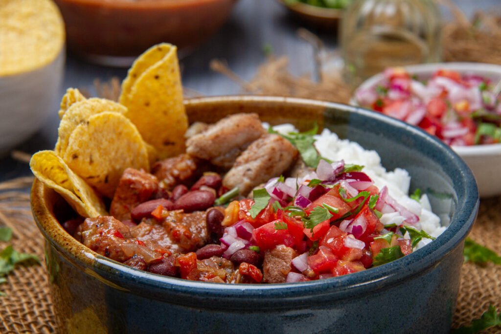 The name is a portmanteau of chicharrón and frijoles — the two primary components of the dish. A bowl of chifrijo is constructed in layers from the bottom up — a base of cooked white rice, then a generous layer of seasoned black or red beans in their cooking liquid, then a topping of chicharrón (fried pork skin and meat — crispy, rich, deeply flavoured), then a spoonful of pico de gallo (fresh tomato, onion, and coriander salsa), then a drizzle of Salsa Lizano. The whole construction is eaten with tortilla chips for scooping.