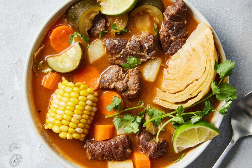 Olla de carne is served as a complete meal — the broth first as a soup, then the meat and vegetables as the main course, accompanied by white rice and sometimes by a small salad. The cooking time — typically three to four hours for a proper olla de carne — produces a broth of extraordinary depth and a beef that falls from the bone with the pressure of a spoon.