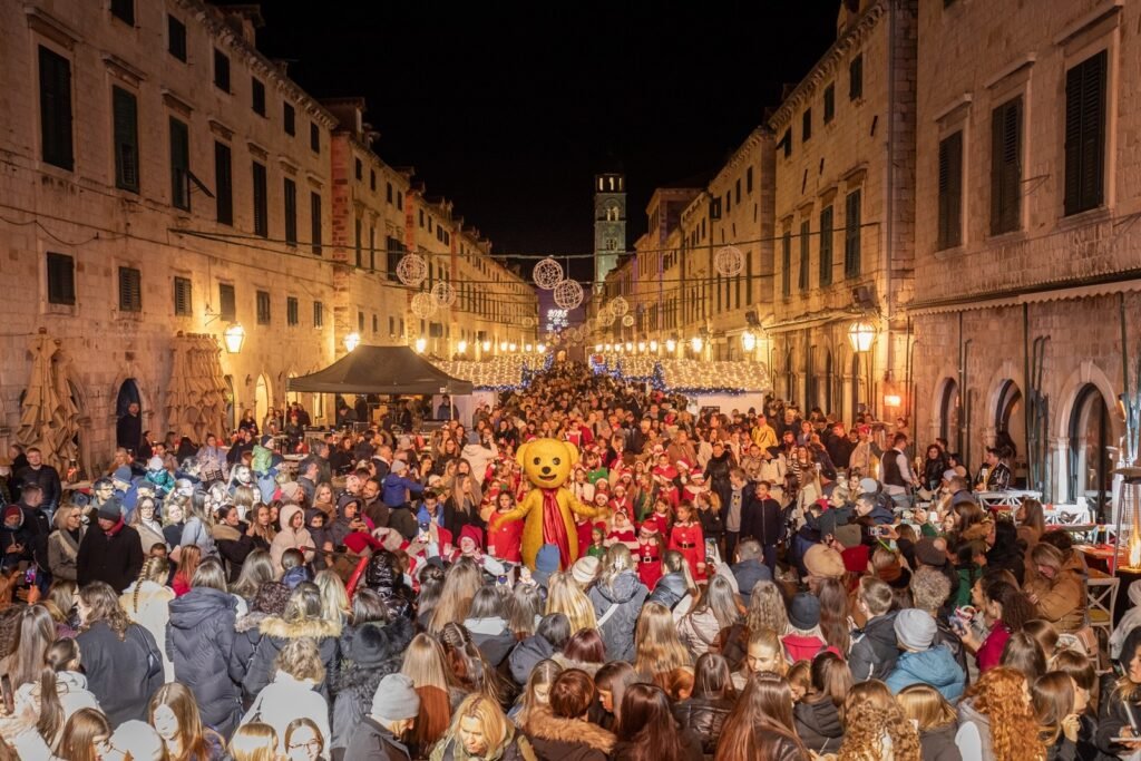 The Stradun — Dubrovnik’s famous limestone-paved main street, polished to a mirror sheen by centuries of foot traffic — serves as the ceremonial heart of the festival and the venue for the opening and closing ceremonies. On special festival evenings, the entire length of this extraordinary thoroughfare becomes a performance space — with audiences lining both sides and performers moving through the city itself as their stage.