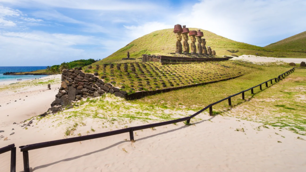 Easter Island’s most beautiful beach is also one of its most historically significant sites. Anakena — a perfect crescent of white coral sand fringed by a grove of palm trees on the island’s northern coast — is believed to be the landing site of the legendary chief Hotu Matu’a, the first Polynesian king to settle Easter Island, making it the birthplace of Rapa Nui civilisation.