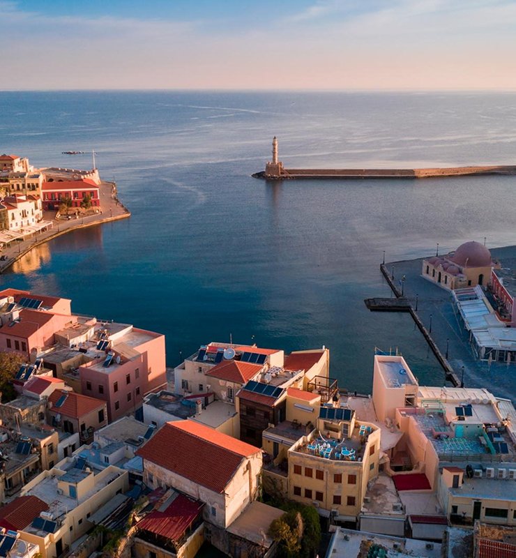 Highlights: Flight to Crete, Chania Old Town, Venetian Harbor, Lighthouse views